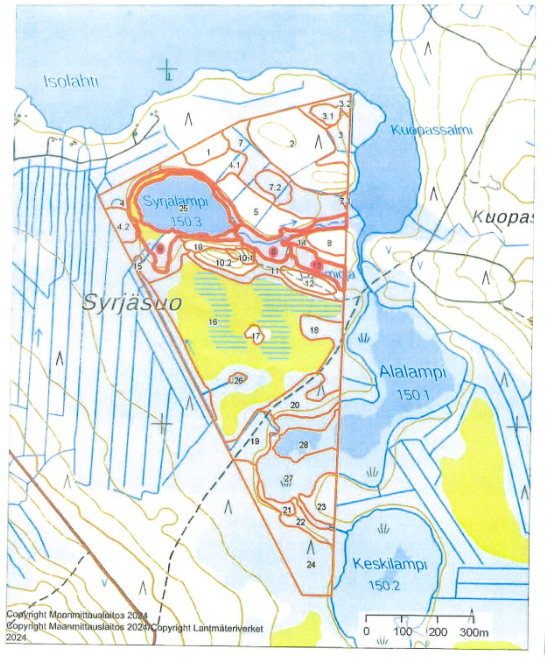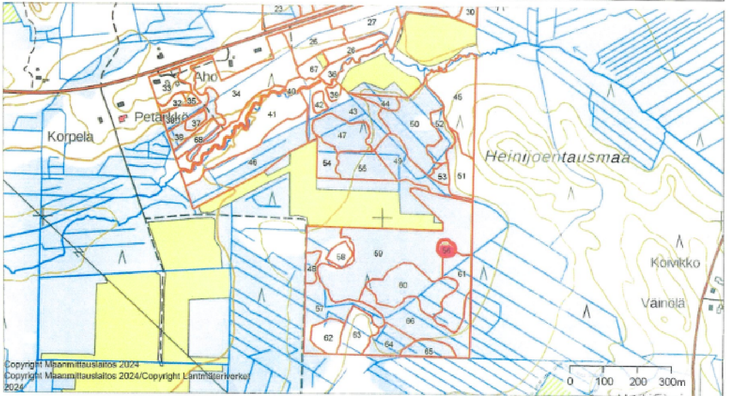 Metsämaata 74,25ha, taimikoita 11,76ha, uudistettavaa metsää 584m3, kasvussa 5889 m3, muuta puustoa 797m3 MHY:n mukaan.