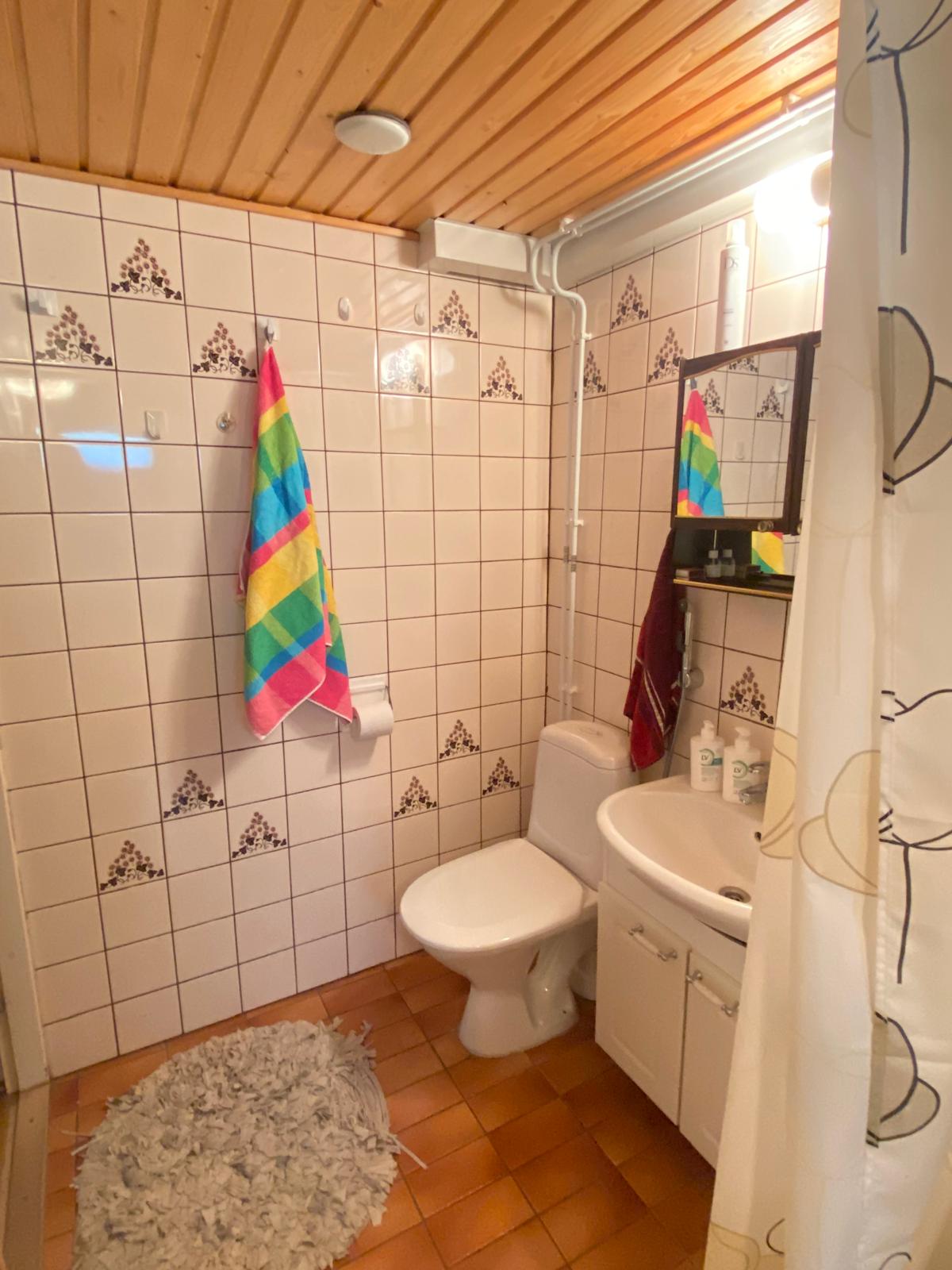 Alakerrassa 3h+k+ph+s. Yläkerrassa 2-3h+wc suihkulla.
